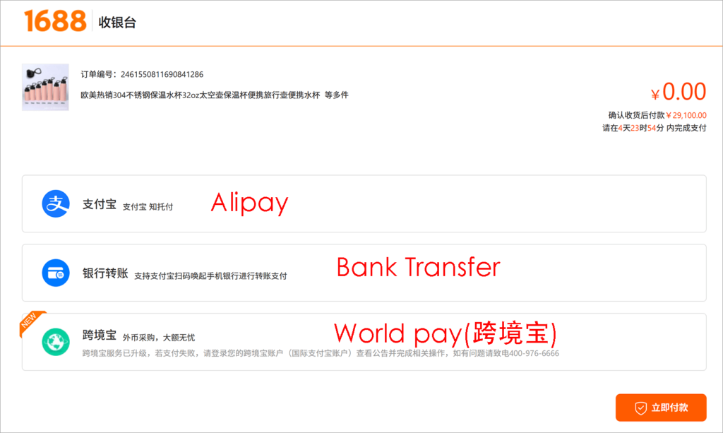 Note:Cross – border Pay (Worldpay 跨境宝) is mainly for international customers to make payments . (The foreign currency needs to be converted into RMB first, and then payments can be made on the 1688 website.)