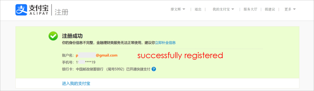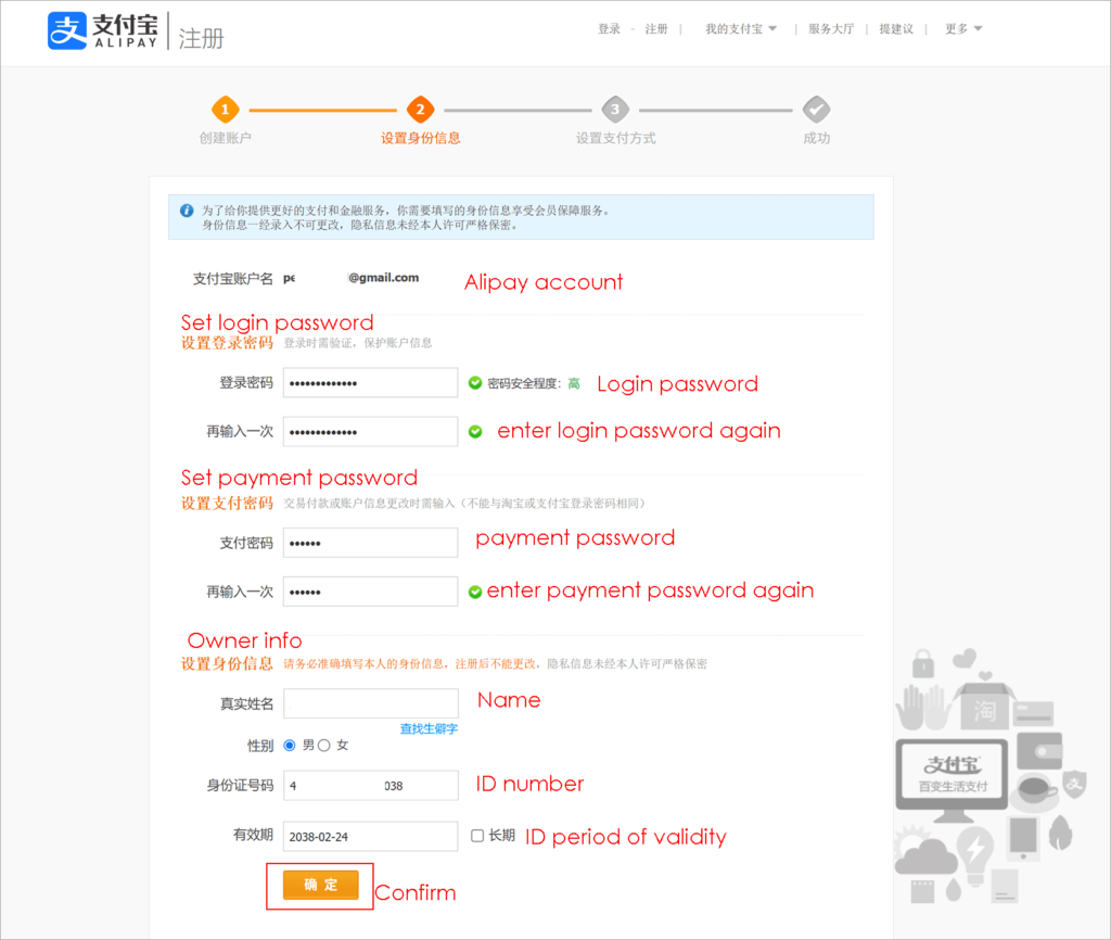 - Click the active link from your email . It needs to fill alipay account info such login password,payment password,name,gender and ID number .