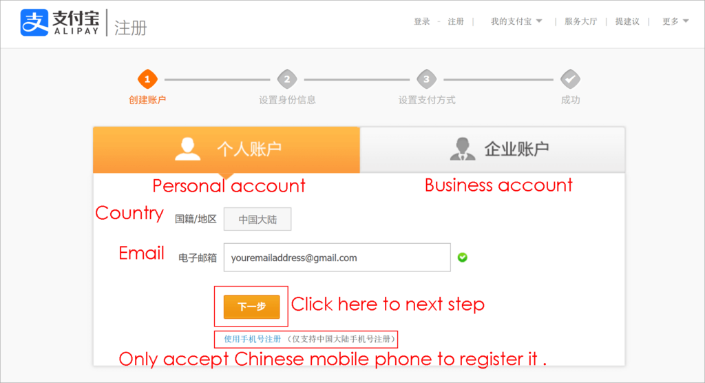 - Choose Personal Account”个人账号”:Left is personal account ,Right is Business account . There are 2 ways to register a personal account . See my photo drawing Number 1 is by App QR code ,Number 2 by mobile phone or Email . For foreigners ,i recommed to register it by email due to only accept Chinese Mobile phone number .