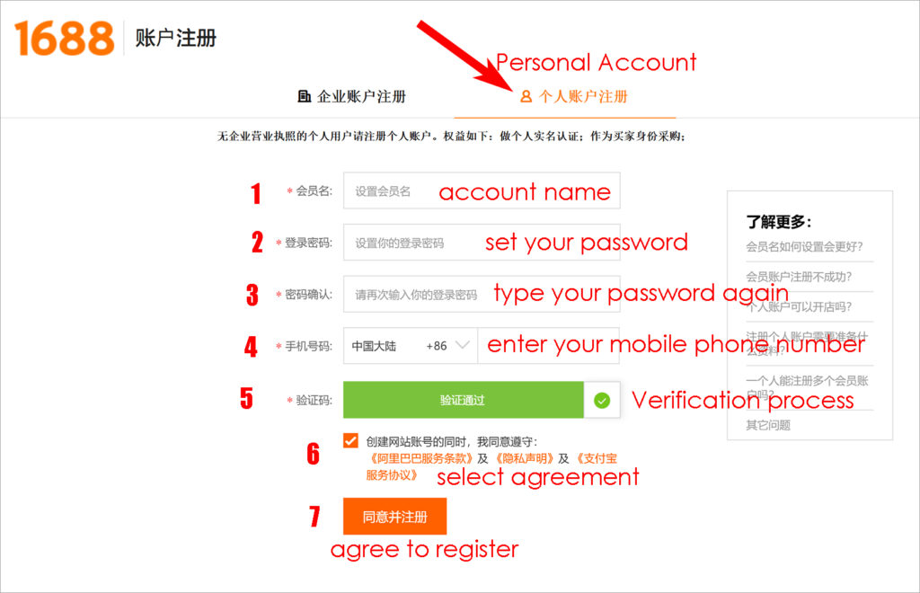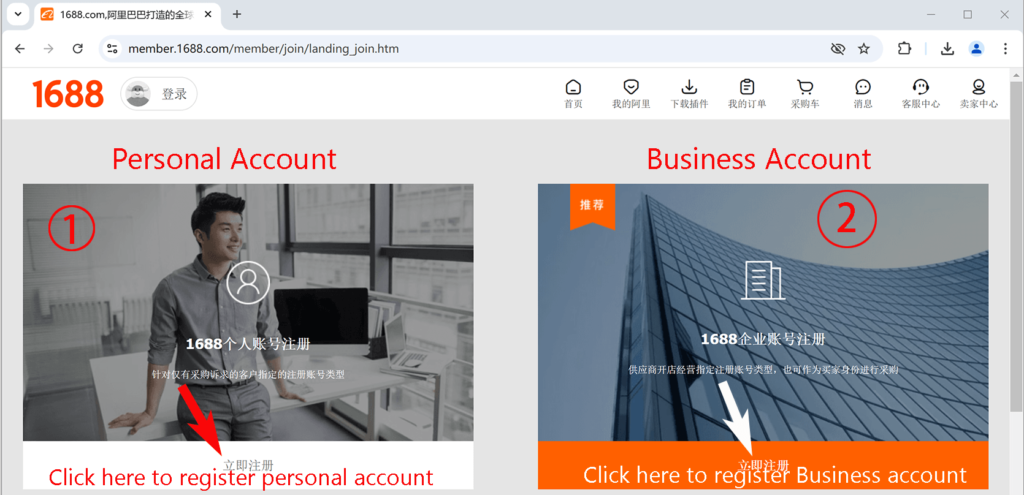 There are two types of 1688.com accounts: personal and Business. How should you choose between them? I recommend registering a personal account, as business account require submitting more documentation to complete the registration process. A personal account is enough if we just purchase products from 1688.com.