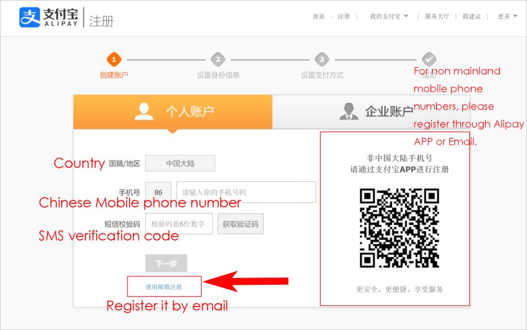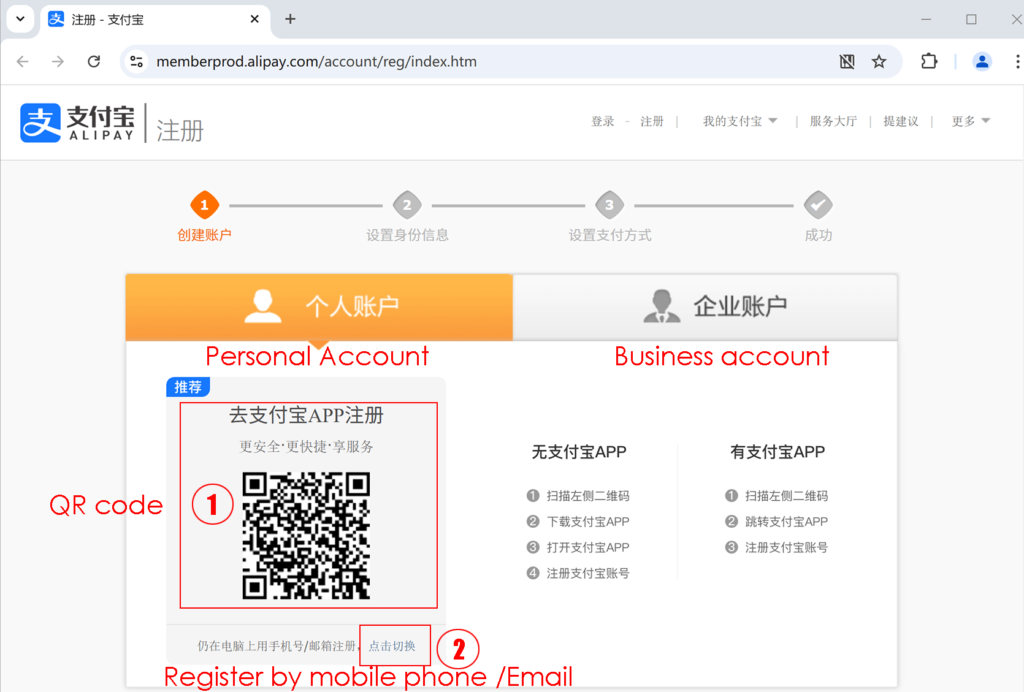 - Choose Personal Account”个人账号”:Left is personal account ,Right is Business account . There are 2 ways to register a personal account . See my photo drawing Number 1 is by App QR code ,Number 2 by mobile phone or Email . For foreigners ,i recommed to register it by email due to only accept Chinese Mobile phone number .