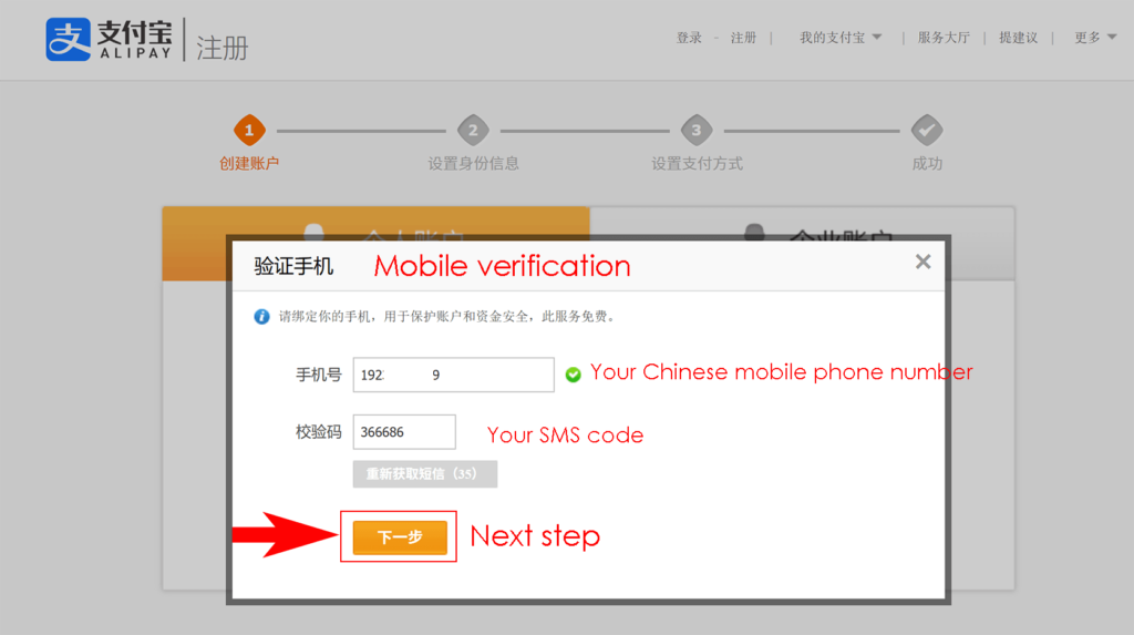 - It still need Chinese Mobile phone number to verify it . Enter mobile phone number ,then get sms verification code. Then click next step “下一步”.
